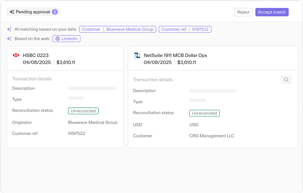 Match everything across your infrastructure as it happens, including pay-ins & payouts, AP & AR, and more