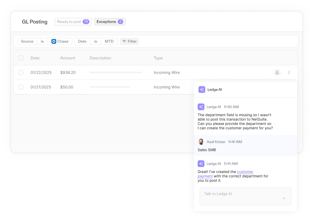 Cash application software helps finance teams match incoming payments to the correct invoices, ensuring accounts receivable is accurate and up to date. With Ledge, you can put cash application on auto-pilot with embedded AI agents to eliminate the manual and error-prone workflows that plague B2B finance teams — especially those using ERPs like NetSuite.